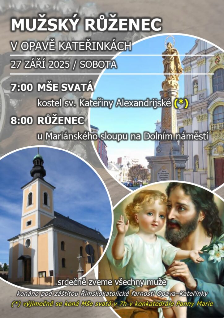 • Ve čtvrtek 25. 9. bude v Domově sv. Kateřiny modlitba růžence v 9:30 h. a v sobotu 27. 9. v 8:00 h. se u mariánského sloupu na Dolním náměstí modlí sv. růženec muži.